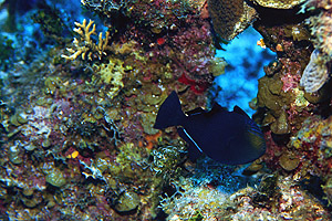 The wall itself, although fascinating and captivating, was not the best part of the dive. The best part was spending 40 minutes in a fin-cross float, hovering above the reef. I pretended to be a piece of flotsam, allowing the surge to take me where-ever it wanted me to go. Once the other divers left the area, the reef came even more alive, as every manner of reef creature came out from hiding. Lobster, a few small crabs, wrasse, gobies, you name it: they all came out to play. The black durgons in the area formed a school and started cruising around as a group. The school of 50 of them swam right around me, offering close-up views (less than 1 foot) of several of them.