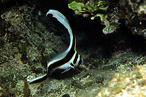 Our last dive of the trip was supposed to be a dawn dive, but we arrived at the dive site a little too late; the skies were already fairly light, and by the time we got to 50 feet, all the night-hunters had gone away. It was still a great dive. Yes, the flamingo tongues were still out in force at 17 feet around the cable. We saw the giant schools of silversides, another yellow stingray, more arrow crabs, a giant puffer, several juvenile spotted drum, and a huge scorpionfish nestled up against the cable at about 15 feet.