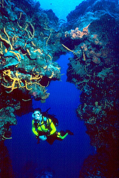 Annemarie and one of the many swimthroughs at Palancar Caves