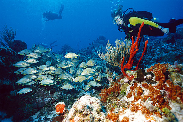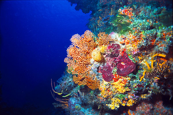 A sea fan reaches into the current at Palancar Caves.