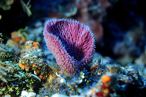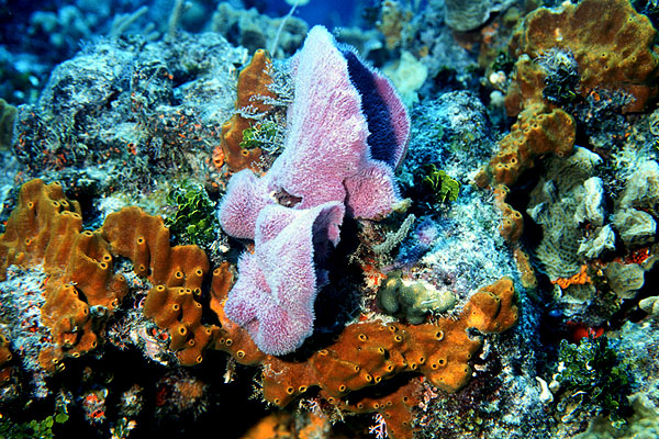 An azure vase sponge grows on the reef