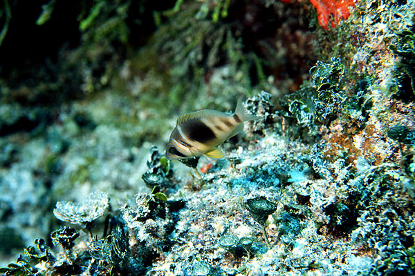 A juvenile yellowtail damselfish pauses long just enough for me to trigger the shutter.