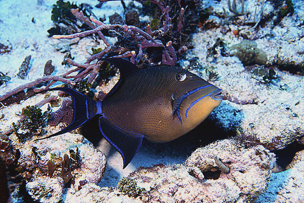 A queen triggerfish swims near the sand.